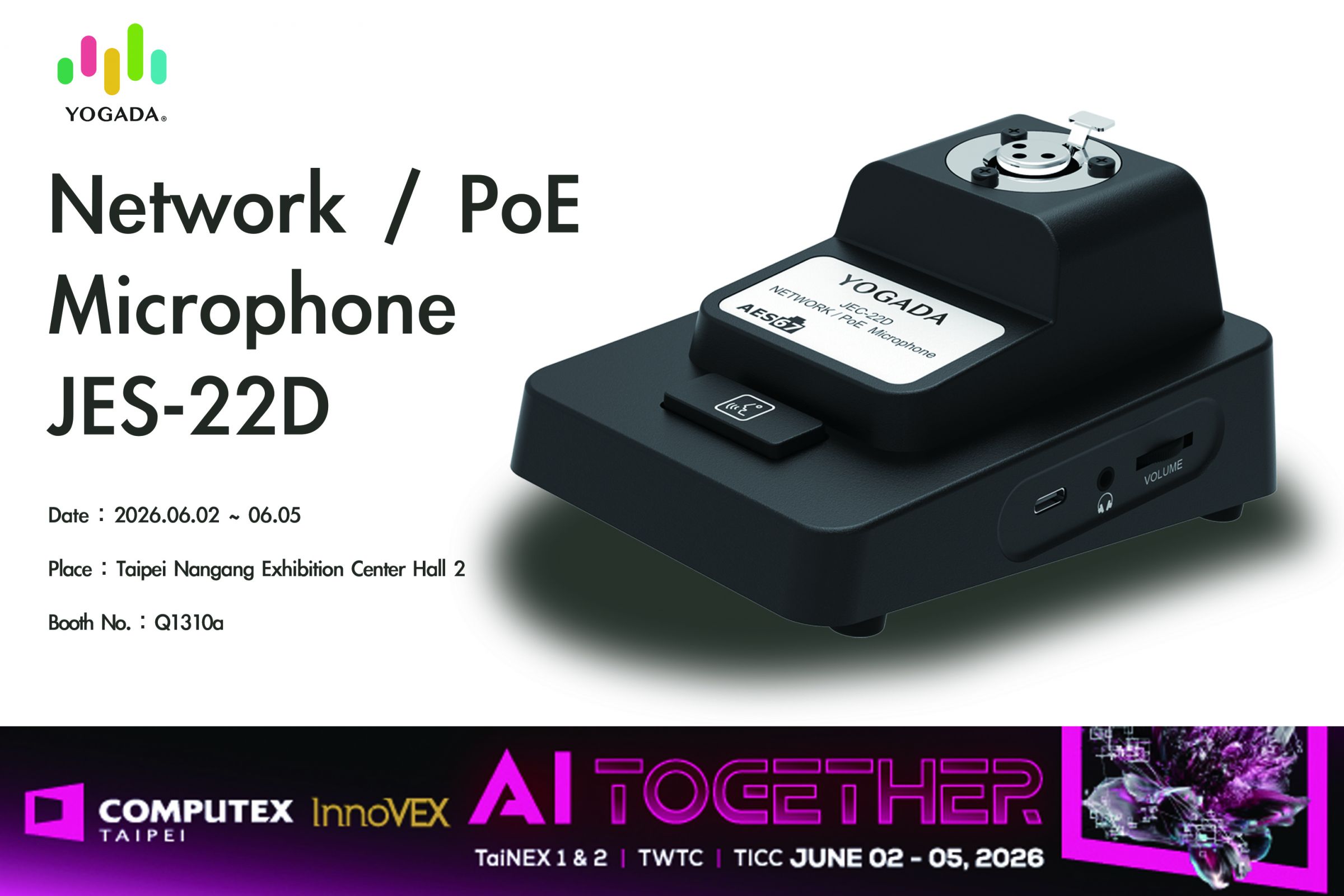 2026/04/20 YOGADAС темой "Искусственный интеллект вместе" YOGADA с радостью присоединяется к COMPUTEX 2026! Мы представим наш разнообразный ассортимент микрофонов, наушников и гарнитур, адаптированных под различные потребности отрасли. Присоединяйтесь к нам по всему миру, чтобы исследовать больше возможностей!